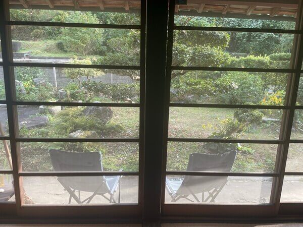 部屋から見える庭と向かいの山の景色